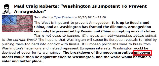 Επιστρέφοντας στον παραπλανητικό ορισμό της Νέας Παγκόσμιας Τάξης που προσφέρουν οι πηγές της παγκοσμιοποιητικής προπαγάνδας, αυτές προσπαθούν να παρουσιάσουν τη Νέα Παγκόσμια Τάξη ως μια προσπάθεια των ΗΠΑ (και των βρετανών συνεργών τους) να δημιουργήσουν μια «μονοπολική» αυτοκρατορία για να ελέγχουν τον κόσμο. Αυτή η υποτιθέμενη προσπάθεια να δημιουργηθεί μια «μονοπολική Νέα Παγκόσμια Τάξη» με επίκεντρο τις ΗΠΑ και το Ηνωμένο Βασίλειο δεν υπήρξε ποτέ. Όπως αναφέρει το Prospect for America :