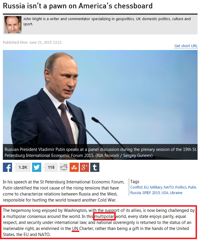 >>> Ο Ρώσος πρόεδρος Βλαντιμίρ Πούτιν δήλωσε το Σάββατο ότι η χώρα του δεν θα δεχτεί ποτέ έναν μονοπολικό κόσμο.