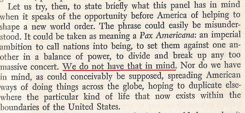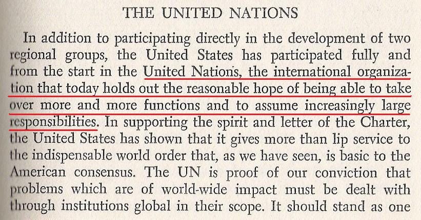Είναι σημαντικό να σημειωθεί ότι μια Νέα Παγκόσμια Τάξη με έδρα τα Ηνωμένα Έθνη δεν μπορεί να κυριαρχείται από τις ΗΠΑ. Οι ΗΠΑ έχουν μόνο 1 ψήφο μεταξύ των 193 στη Γενική Συνέλευση και μόνο 1 ψήφο μεταξύ των 15 στο Συμβούλιο Ασφαλείας. Οποιαδήποτε αντίληψη για την ηγεσία των ΗΠΑ στον ΟΗΕ προέκυψε από τη δύναμη και το κύρος της Αμερικής μετά τον Β’ Παγκόσμιο Πόλεμο και τον προσωρινό ρόλο του δολαρίου ΗΠΑ ως του κύριου αποθεματικού νομίσματος στον κόσμο. Αυτό το κύρος έχει πλέον χαθεί, και η δύναμη μετά τον Β’ Παγκόσμιο Πόλεμο θα χαθεί σε μεγάλο βαθμό μόλις το δολάριο αντικατασταθεί από ένα μετονομασμένο SDR ως το κύριο αποθεματικό νόμισμα του κόσμου. Για να αναδειχθεί το συγκρότημα του ΟΗΕ ως η κεντρική δύναμη, η υπερδύναμη των ΗΠΑ που αναδείχθηκε μετά τον Β’ Παγκόσμιο Πόλεμο έπρεπε να καταρριφθεί, και το Prospect for America ήταν το σχέδιο για την πτώση της.
