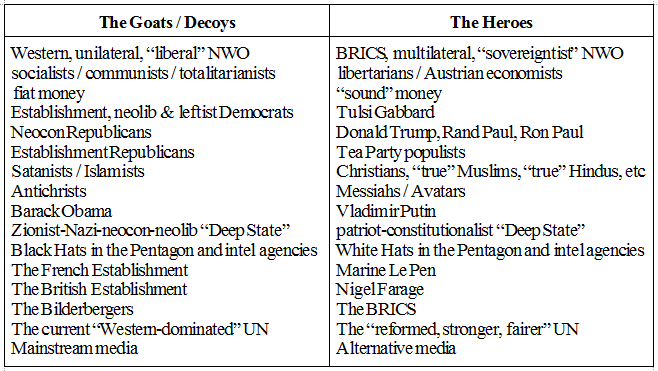 Όπως επισημαίνω σε όλο αυτό το blog, οι παγκοσμιοποιητές έχουν χωρίσει τους υπηρέτες τους σε δύο ομάδες: τα Black Hats και τα White Hats. Και έχουν βάλει τα ελεγχόμενα εναλλακτικά μέσα ενημέρωσης να παρουσιάζουν τα Black Hats ως ανθρώπους που προσπαθούν να χτίσουν μια κακή «δυτική» Νέα Παγκόσμια Τάξη. Ταυτόχρονα, παρουσιάζουν τα White Hats ως αυτούς που προσπαθούν να σταματήσουν το κακό και να χτίσουν μια καλοπροαίρετη Νέα Παγκόσμια Τάξη με επικεφαλής τις χώρες BRICS. Περιττό να πούμε ότι οι «ήρωες» των Λευκών Καπέλων είναι προορισμένοι να κερδίσουν αυτή τη σύγκρουση, και η νίκη τους θα φέρει την πραγματική Νέα Παγκόσμια Τάξη που οι παγκοσμιοποιητές σχεδιάζουν από την αρχή.