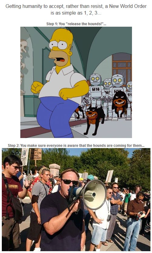 Βήμα 2: Έχουν βάλει τον ψευτο-αληθινό / ελεγχόμενο αντιπολιτευτικό Τύπο να φωνάζει σε όλους ότι τα κυνηγόσκυλα μας κυνηγούν, ώστε να φοβηθούμε και να αναζητήσουμε ασφάλεια.