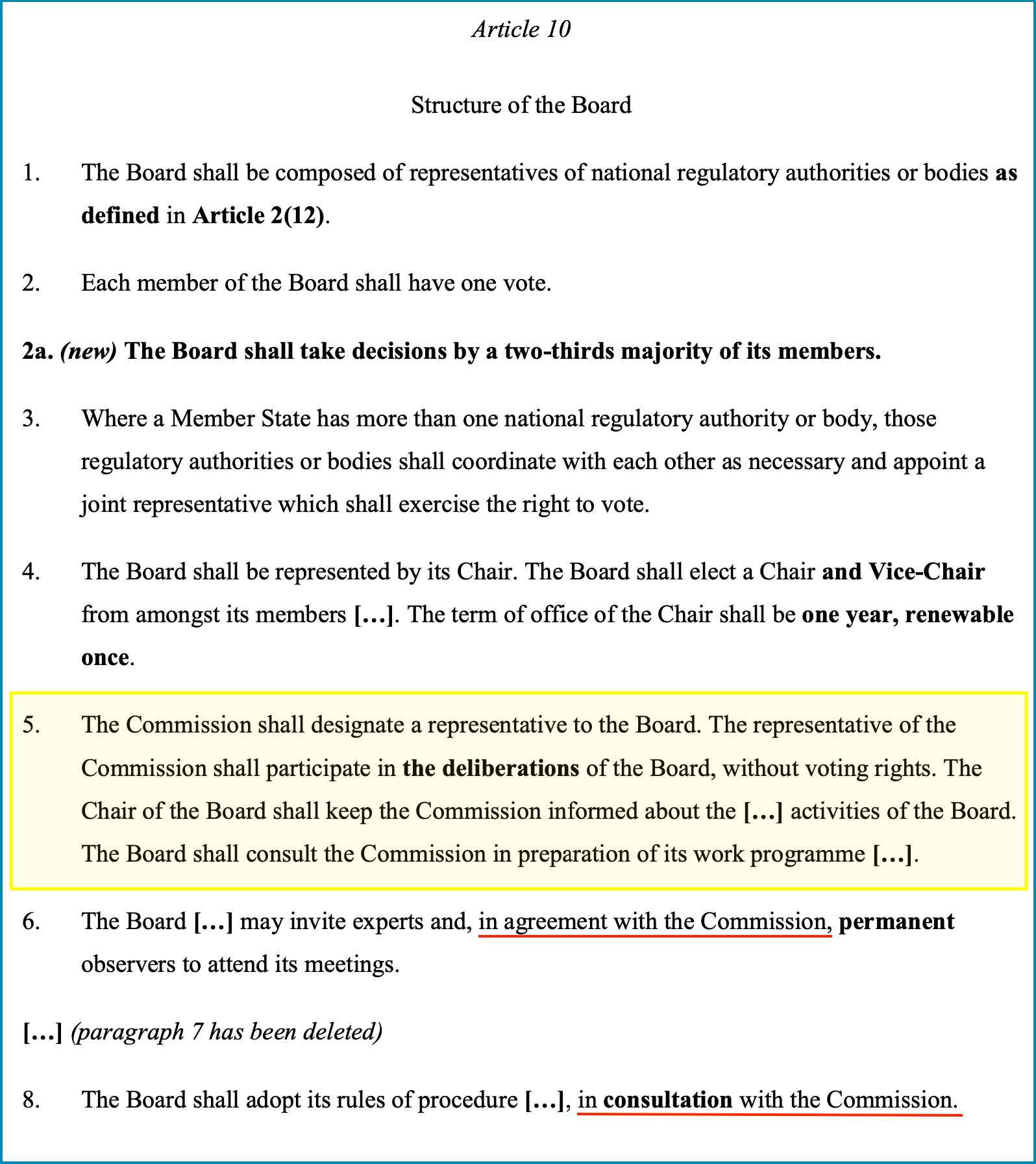 Επιπλέον, το Διοικητικό Συμβούλιο πρέπει να εγκρίνει τον κανονισμό και τη διαδικασία του και την ανάπτυξη του προγράμματος εργασίας του μόνο μετά από διαβούλευση με την Επιτροπή. Ενώ το Διοικητικό Συμβούλιο μπορεί να προσκαλεί εμπειρογνώμονες να παρίστανται στις συνεδριάσεις, μόνιμοι συμμετέχοντες μπορούν να επιτραπούν μόνο εφόσον συμφωνεί η Επιτροπή.