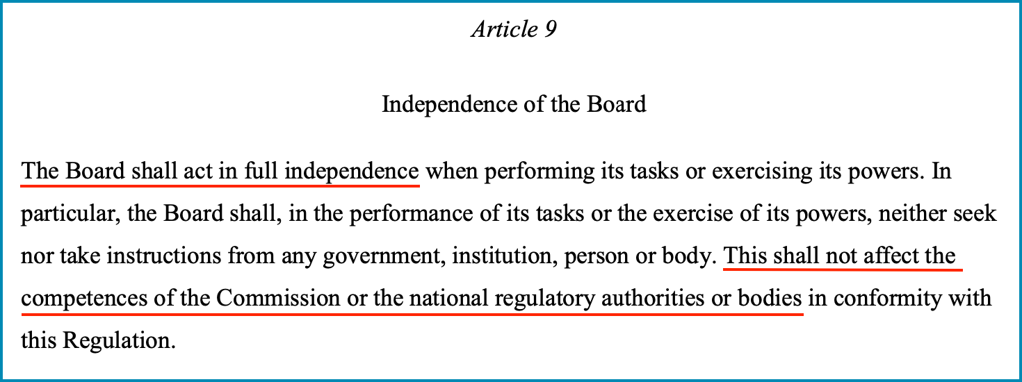 Το Συμβούλιο παρουσιάζεται ως ανεξάρτητο όργανο. Το άρθρο 9 διαβεβαιώνει “την πλήρη ανεξαρτησία του Συμβουλίου” και αναφέρει ότι το Συμβούλιο “… δεν ζητά ούτε δέχεται οδηγίες από κανένα κυβερνητικό όργανο, πρόσωπο ή οργανισμό. Αυτό δεν επηρεάζει τις αρμοδιότητες της Επιτροπής ή των εθνικών ρυθμιστικών αρχών ή φορέων σύμφωνα με τον παρόντα κανονισμό.”