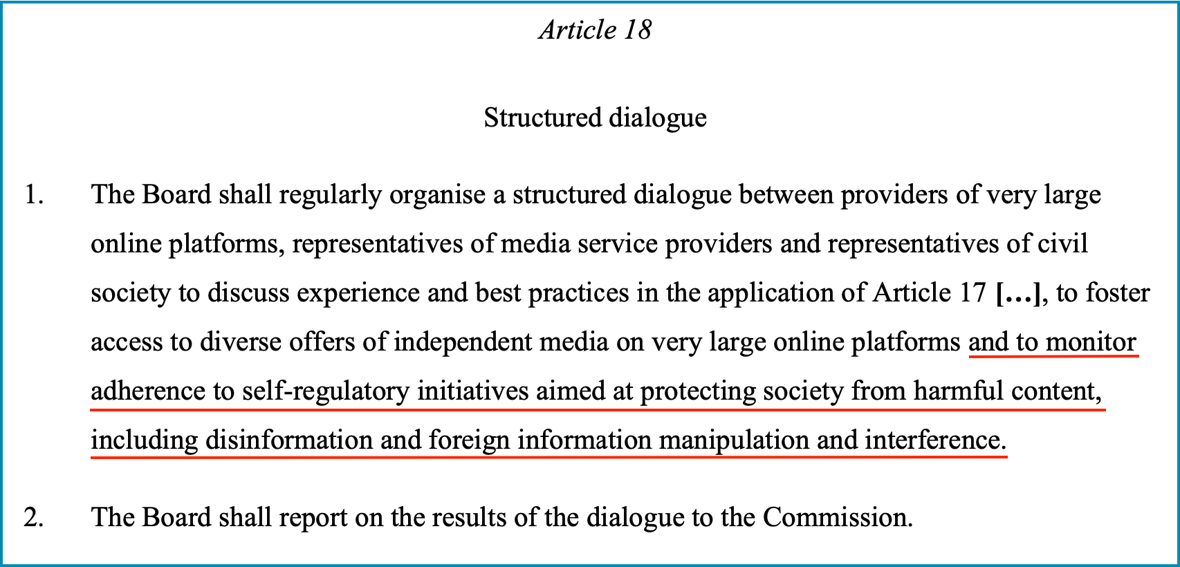 Το συμβούλιο οργανώνει τακτικά δομημένο διάλογο μεταξύ παρόχων πολύ μεγάλων διαδικτυακών πλατφορμών, εκπροσώπων των παρόχων υπηρεσιών μέσων επικοινωνίας και εκπροσώπων της κοινωνίας των πολιτών για να συζητήσουν την εμπειρία και τις βέλτιστες πρακτικές στην εφαρμογή του άρθρου 17 […], για την προώθηση της πρόσβασης σε ποικίλες προσφορές ανεξάρτητων μέσων ενημέρωσης σε πολύ μεγάλες διαδικτυακές πλατφόρμες και παρακολούθηση της τήρησης πρωτοβουλιών αυτορρύθμισης που στοχεύουν στην προστασία της κοινωνίας από επιβλαβές περιεχόμενο, συμπεριλαμβανομένης της παραπληροφόρησης και της χειραγώγησης και παρέμβασης ξένων πληροφοριών.
