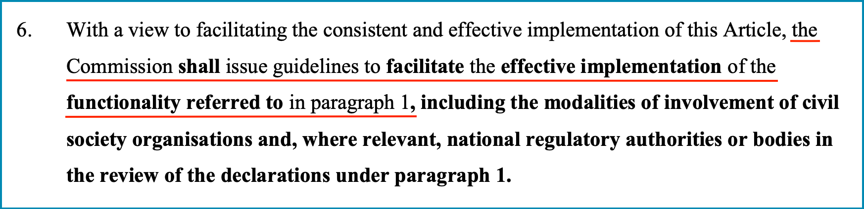 μτφρ. κειμένου εικόνας: Προκειμένου να διευκολυνθεί η συνεπής και αποτελεσματική εφαρμογή του παρόντος άρθρου, η Επιτροπή εκδίδει κατευθυντήριες γραμμές για να διευκολύνει την αποτελεσματική εφαρμογή της λειτουργικότητας που αναφέρεται στην παράγραφο 1, συμπεριλαμβανομένων των τρόπων συμμετοχής των οργανώσεων της κοινωνίας των πολιτών και, κατά περίπτωση, των εθνικών ρυθμιστικών αρχών ή φορέων κατά την επανεξέταση των δηλώσεων σύμφωνα με την παράγραφο 1.