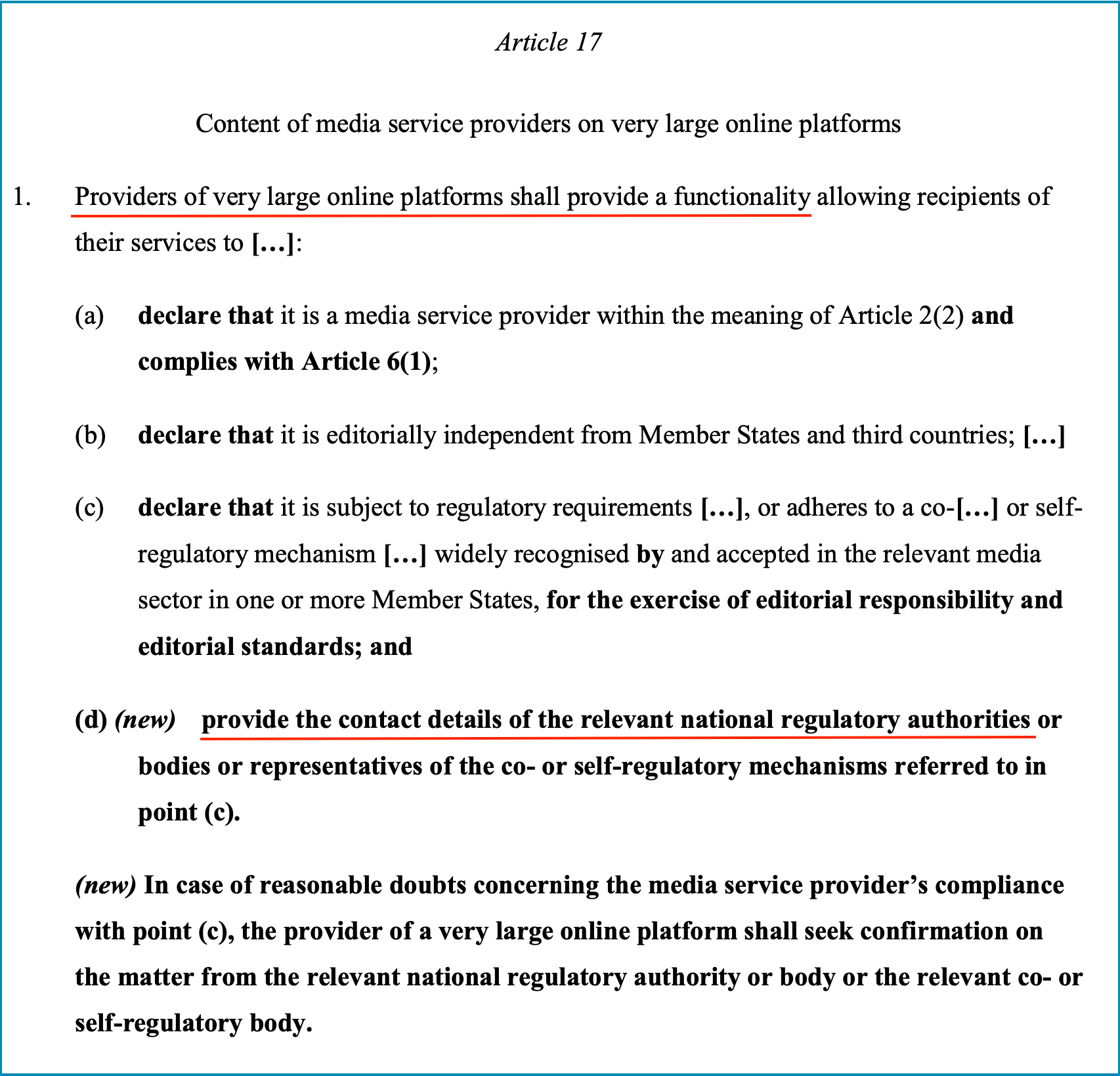 Το άρθρο 17 καθορίζει τη λειτουργία και τη διαχείριση του περιεχομένου των παρόχων υπηρεσιών μέσων ενημέρωσης σε σχέση με τους παρόχους πολύ μεγάλων επιγραμμικών πλατφορμών (VLOP). Σύμφωνα με το αρχικό σχέδιο πρότασης, ο πάροχος VLOP ορίζεται ως “πάροχος επιγραμμικής πλατφόρμας που έχει χαρακτηριστεί ως πολύ μεγάλη επιγραμμική πλατφόρμα σύμφωνα με το άρθρο 25 παράγραφος 4” της DSA.
