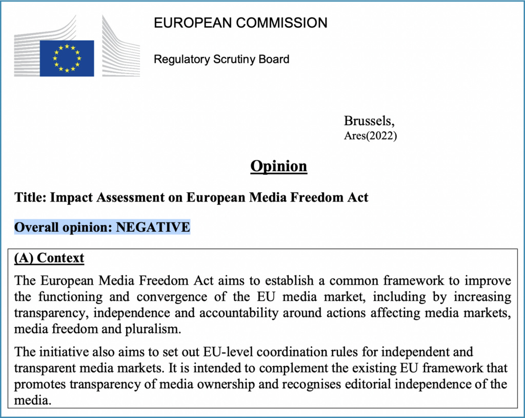 Έναν μόλις μήνα μετά την υποβολή της έκθεσης αξιολόγησης των επιπτώσεων της πρωτοβουλίας EMFA από την Επιτροπή, το RSB επέστρεψε αρνητική γνώμη τον Ιούνιο του 2022.