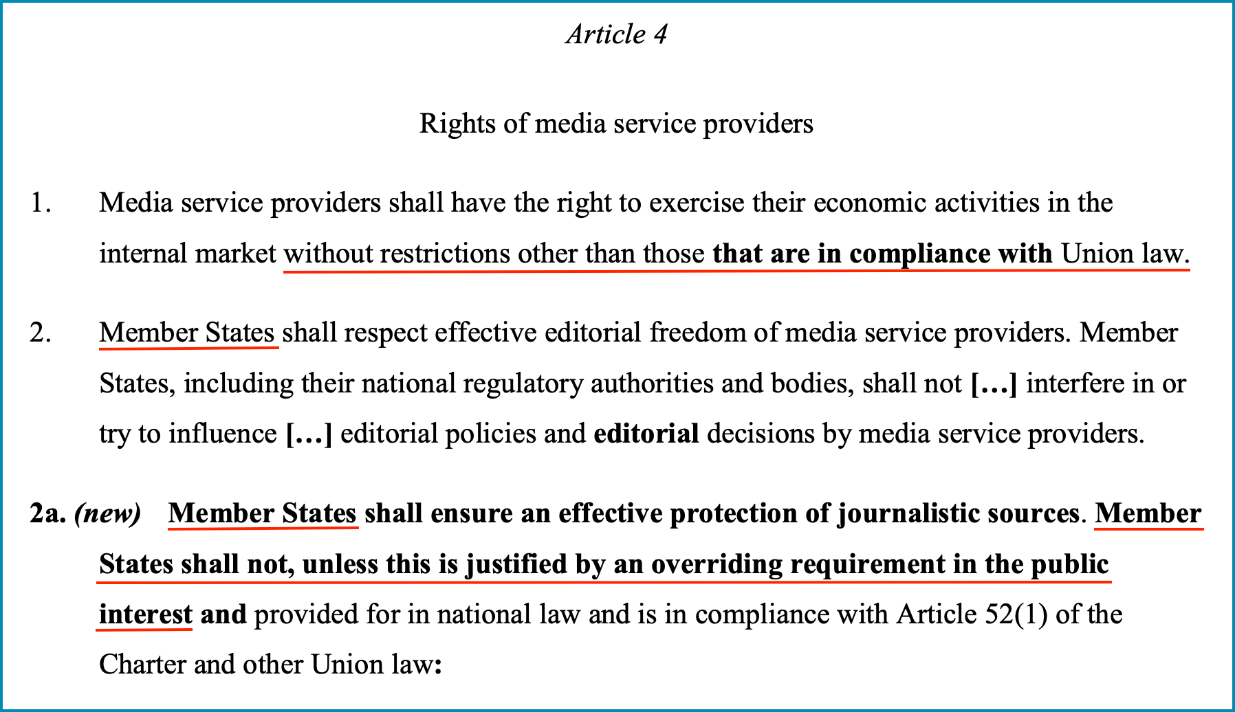 Επιπλέον, το άρθρο 4 παράγραφος 2α ασχολείται με τα δικαιώματα των MSP στο πλαίσιο του τι δεν πρέπει να κάνουν τα κράτη μέλη και οι εθνικές ρυθμιστικές αρχές. Μεγάλο μέρος της διαμάχης γύρω από την EMFA είναι το παραθυράκι της, το οποίο επιτρέπει στα κράτη μέλη να κατασκοπεύουν δημοσιογράφους, MSP και τις ενώσεις τους, εάν θεωρηθεί ότι αποτελούν απειλή για την εθνική ασφάλεια.
