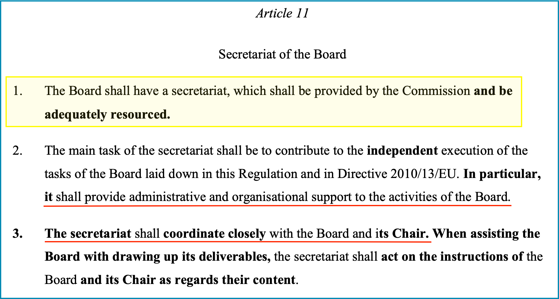 Το άρθρο 11 της γνωμοδότησης IMCO αφαιρεί τη διάταξη που ορίζει ότι η Γραμματεία παρέχεται από την Επιτροπή και, αντ’ αυτού, αναφέρει ότι “Το Συμβούλιο υποστηρίζεται από ανεξάρτητο γραφείο.” Ωστόσο, και οι δύο επιτροπές διατηρούν το άρθρο 10 παράγραφος 5, το οποίο επιτρέπει στην Επιτροπή να διορίζει έναν εκπρόσωπο στο διοικητικό συμβούλιο.