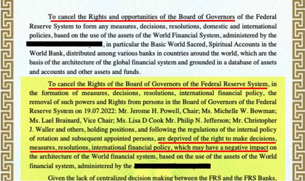 Aκυρώνονται (cancel) τα δικαιώματα και οι εξουσίες του Συμβουλίου των Διοικητών του Ομοσπονδιακού Αποθεματικού Συστήματος (FED), και άλλων, που κατέχουν θέσεις, και ακολουθούν τους κανονισμούς της εσωτερικής πολιτικής, της κυκλικής εναλλαγής και των μεταγενέστερων διορισμένων προσώπων………..