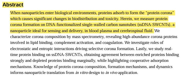 Ωστόσο, όταν τα νανοσωματίδια “εισάγονται” σε βιολογικά συστήματα, οι πρωτεΐνες προσροφώνται αυθόρμητα στις επιφάνειες των νανοσωματιδίων, με αποτέλεσμα να οδηγούν στο σχηματισμό της «protein corona» (πρωτεϊνικής κορώνας).