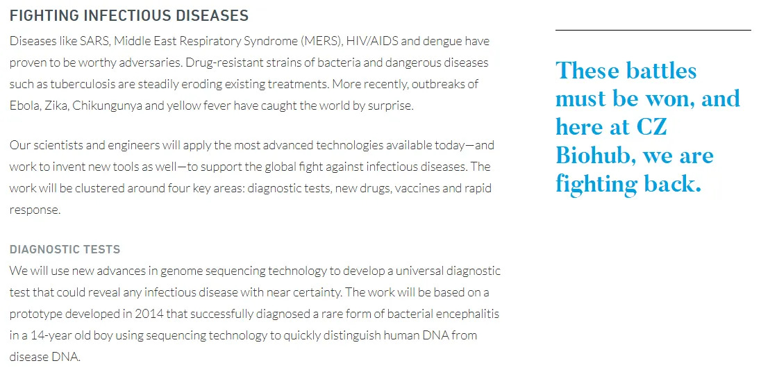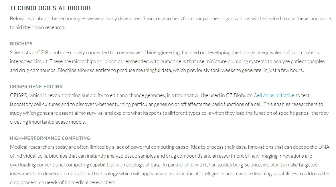 Οι επιστήμονες του Chan-Zuckerberg Biohub συνδέονται στενά με ένα νέο κύμα βιοτεχνολογίας, που επικεντρώνεται στην ανάπτυξη του βιολογικού ισοδύναμου ενός ολοκληρωμένου κυκλώματος υπολογιστή. Πρόκειται για μικροτσίπ ή «βιοτσίπ» ενσωματωμένα σε ανθρώπινα κύτταρα που χρησιμοποιούν μικροσκοπικά συστήματα σωληνώσεων για την ανάλυση δειγμάτων ασθενών και φαρμακευτικών ενώσεων. Τα βιοτσίπ επιτρέπουν στους επιστήμονες να παράγουν σημαντικά δεδομένα, τα οποία προηγουμένως χρειάζονταν εβδομάδες για να δημιουργηθούν, σε λίγες μόνο ώρες.
