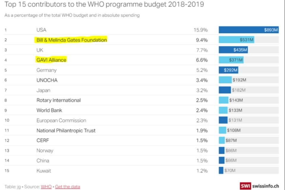 Ιστορικά, το Ίδρυμα Μπιλ και Μελίντα Γκέιτς, μαζί με τη συμμαχία GAVI για τα εμβόλια που υποστηρίζεται από τους Γκέιτς, έχουν συνεισφέρει περισσότερα στον προϋπολογισμό του προγράμματος του ΠΟΥ από όλα τα κράτη μέλη, εκτός από δύο - τις ΗΠΑ και το Ηνωμένο Βασίλειο.